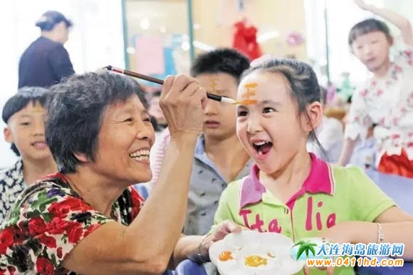 端午節時以雄黃涂抹小兒額頭的習俗,云可驅避毒蟲。典型的方法是用雄黃酒在小兒額頭畫“王”字,一借雄黃以驅毒,二借猛虎(“王”似虎的額紋,虎為獸中之王)以鎮邪。