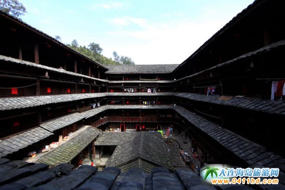 【懷遠樓】建于清宣統元年(1909年),坐北朝南,占地1384.7平方米,高4層,14.5米,是建筑工藝最精美、保護最好的雙環圓形土樓。